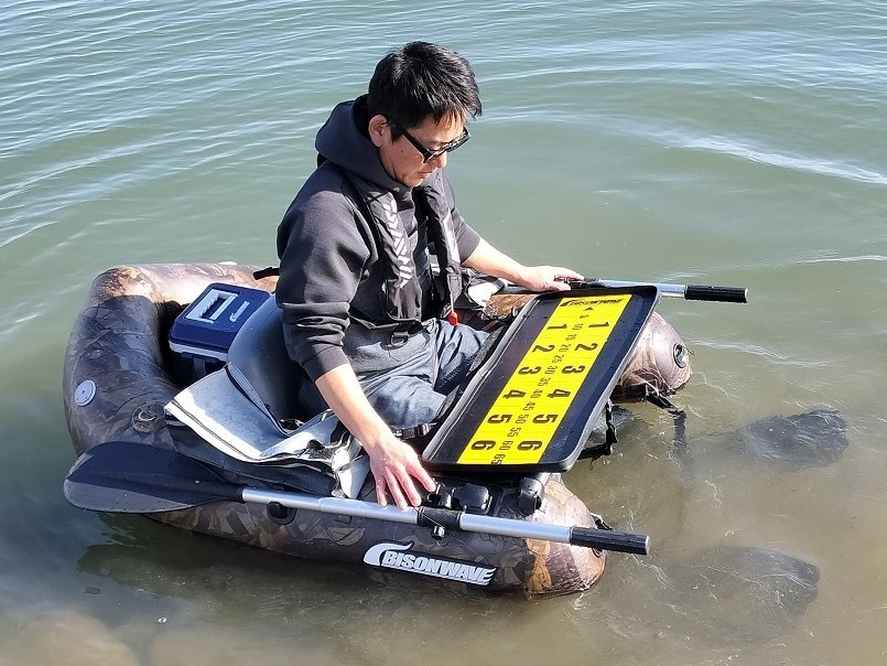 フローター本体に乾電池式魚探一式を簡単に装着できるホルダーです。魚探本体はオールと干渉しない位置に設置できます。